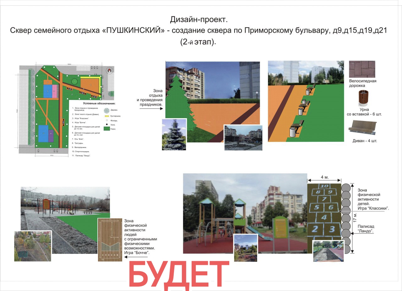 В рамках 2-ого этапа будут выложены тротуарной плиткой дорожки, зоны для проведения культурно-массовых мероприятий, детских подвижных игр, турниров для людей с ограниченными физическими возможностями, установлены скамейки и урны, высажены ель и декоративный кустарник, восстановлен газон. Сквер станет инклюзивным пространством для жителей.