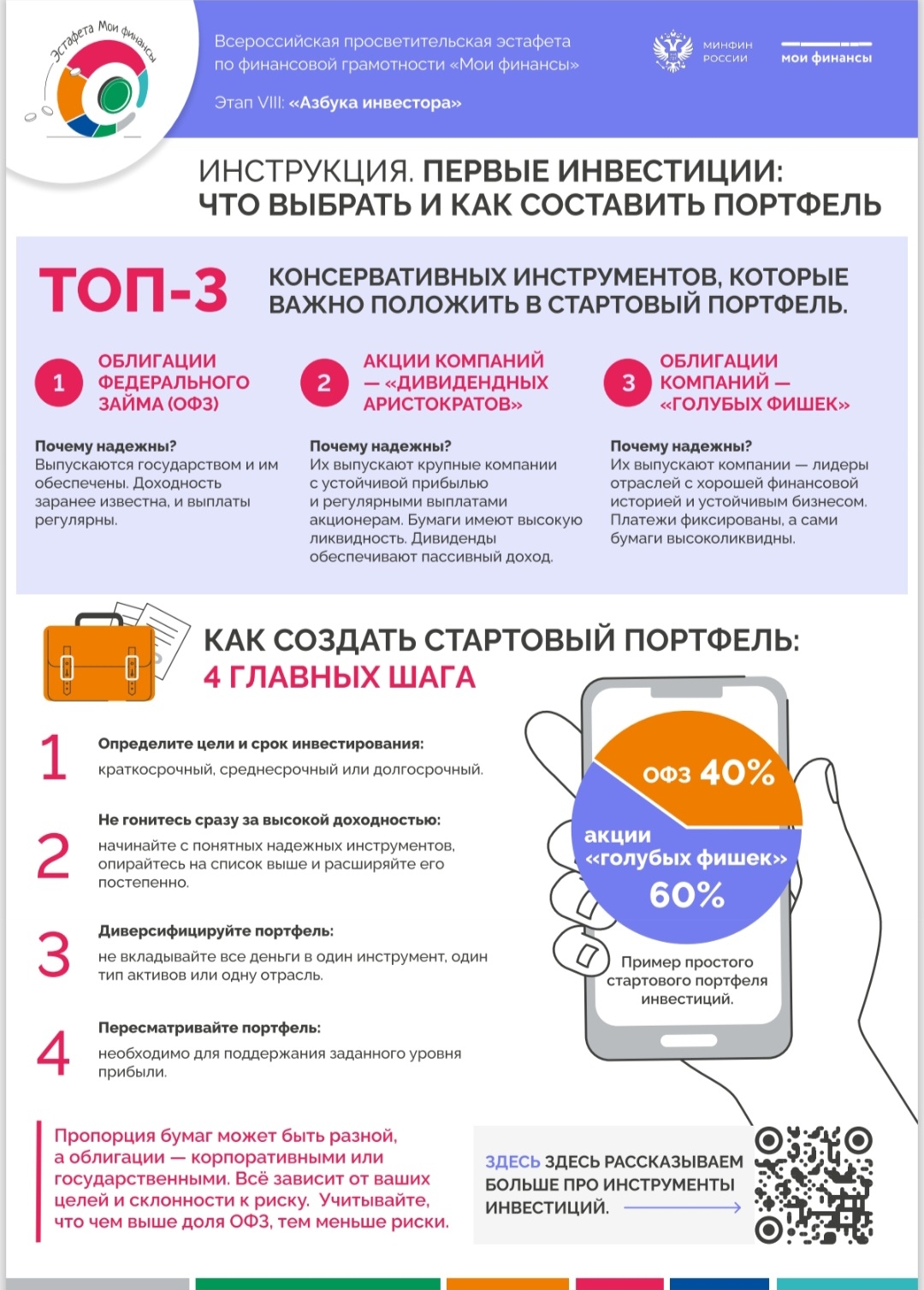 Специально для эстафеты НИФИ Минфина России подготовил множество информационно-просветительских материалов: мини-игры, ребусы, гайды, чек-листы и памятки по инвестиционной грамотности для детей и взрослых. Материалы доступны для свободного скачивания на портале «Моифинансы.рф», в специальном разделе: