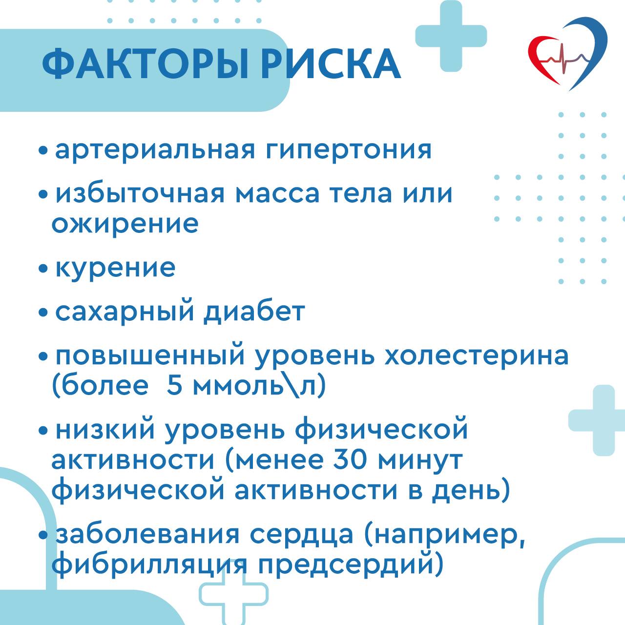 Основные факторы риска ишемического инсульта: - артериальная гипертония - атеросклероз - сахарный диабет - нарушения сердечного ритма - курение - избыточная масса тела - малоподвижный образ жизни - возраст - наследственная предрасположенность.