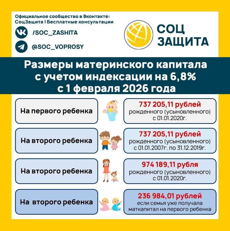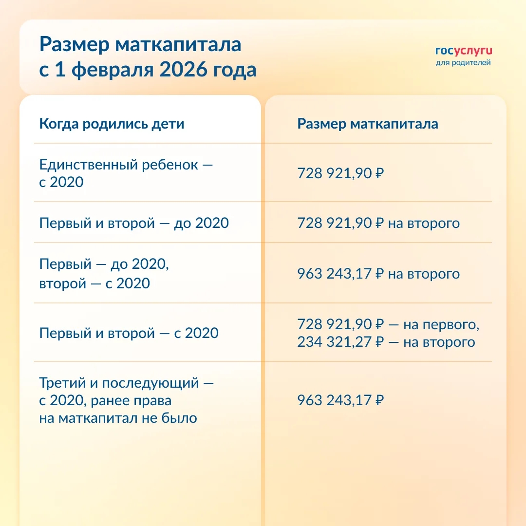 С 1 февраля 2026 года маткапитал увеличится на 5,6%.