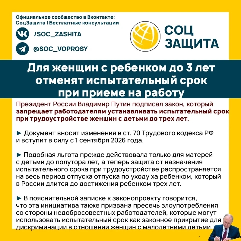 Для женщин с ребенком до 3 лет отменят испытательный срок при приеме на работу. Подписаться https://max.ru/soc_zashita