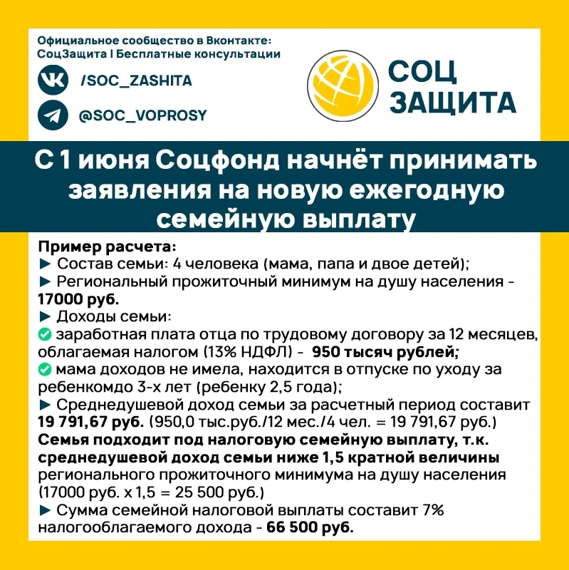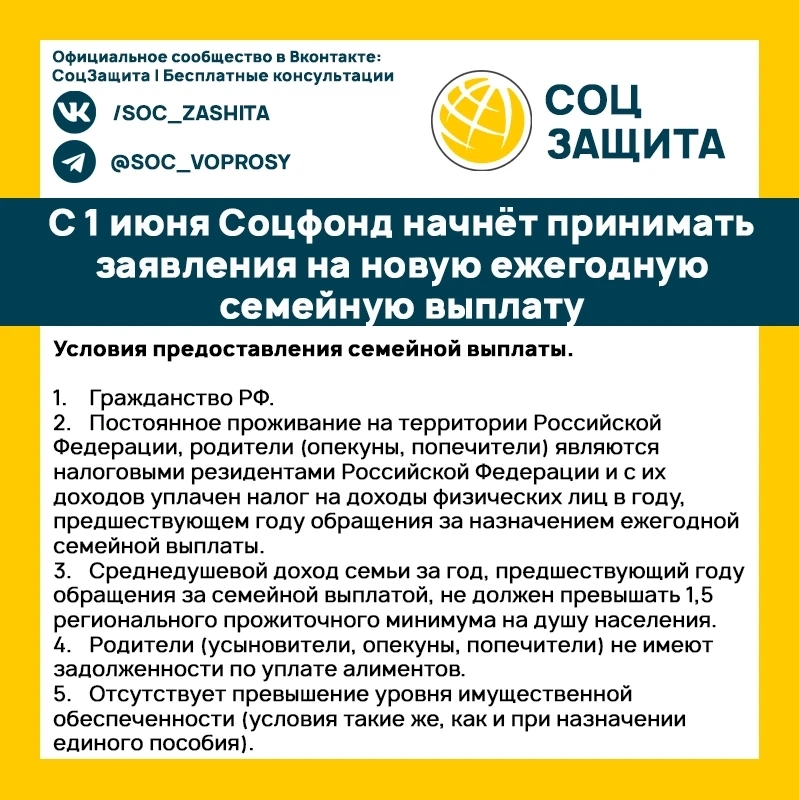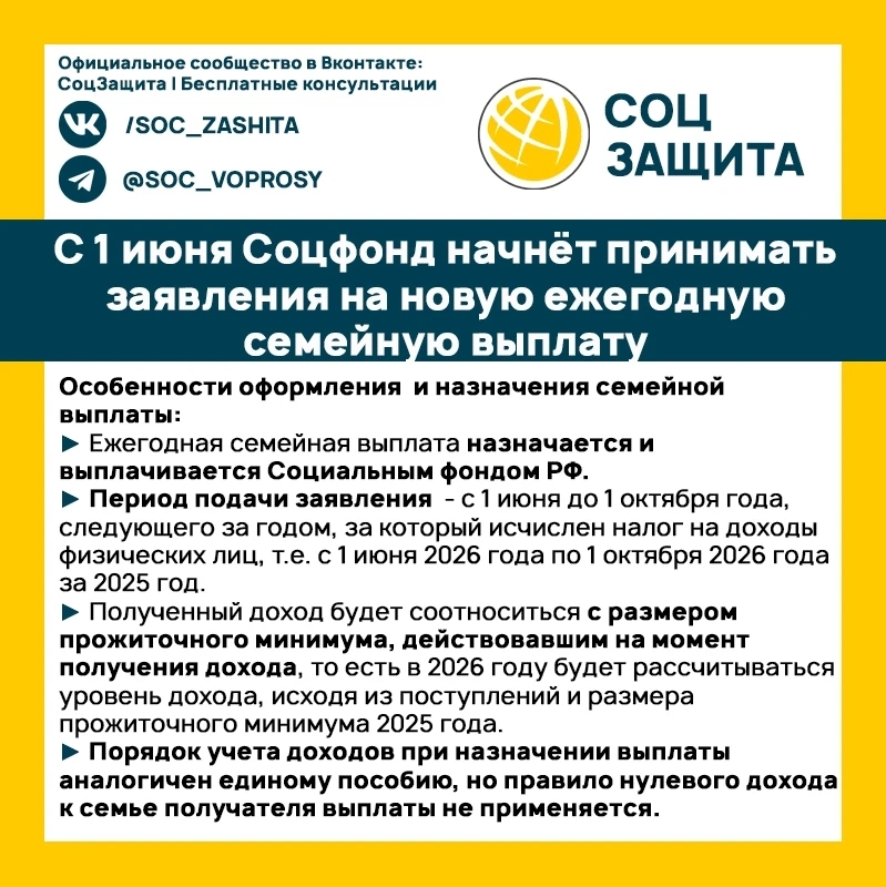 с 1 июня Соцфонд начнёт принимать заявления на новую ежегодную семейную выплату.